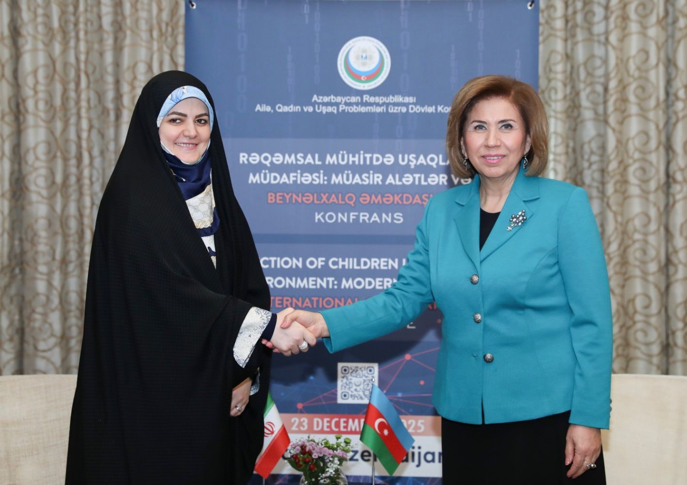“Rəqəmsal mühitdə uşaqların müdafiəsi: müasir alətlər və beynəlxalq əməkdaşlıq” mövzusunda keçirilən beynəlxalq konfrans çərçivəsində Ailə, Qadın və Uşaq Problemləri üzrə Dövlət Komitəsinin sədri Bahar Muradova ilə İran İslam Respublikasının Prezidentinin qızı Zəhra Pezeşkian arasında görüş baş tutub.