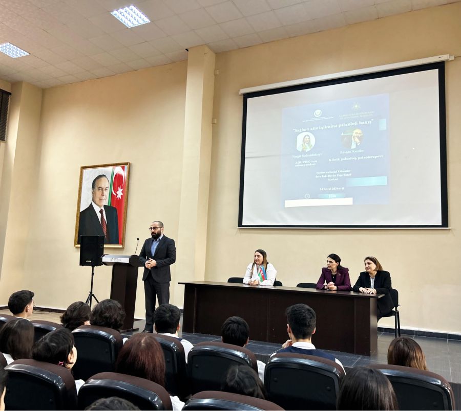 Gənclərin və müəllimələrin iştirakı ilə keçirilən tədbirdə mütəxəssis qismində çıxış edən klinik psixoloq, psixoterapevt Rövşən Nəcəfov ailədaxili münasibətlərin düzgün tənzimlənməsi, sağlam cəmiyyətin qurulmasında sosial məsuliyyətin rolu və süni intellektdən düzgün istifadə barədə geniş məlumat verib.