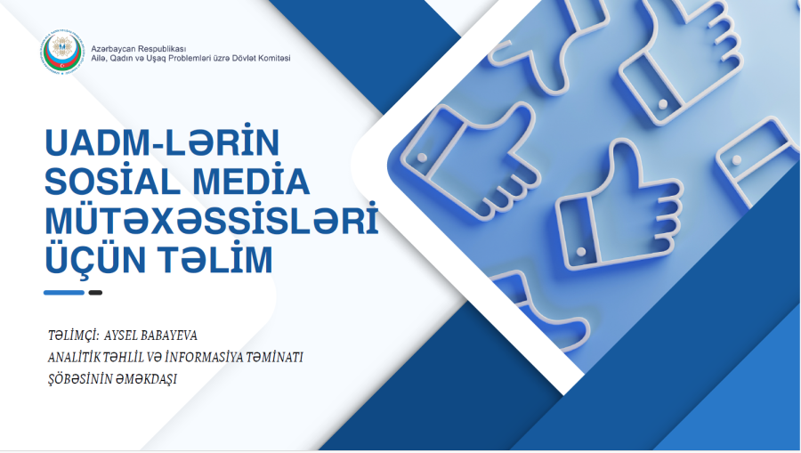 21 yanvar 2026-cı il tarixində Ailə, Qadın və Uşaq Problemləri üzrə Dövlət Komitəsinin tabeliyində olan Uşaq və Ailələrə Dəstək Mərkəzlərinin (UADM) direktorları və əməkdaşlarının iştirakı ilə Mərkəzlərin sosial media səhifələrinin aktivliyinin artırılması və düzgün kontent strategiyasının qurulması mövzusunda təlim təşkil olunub.