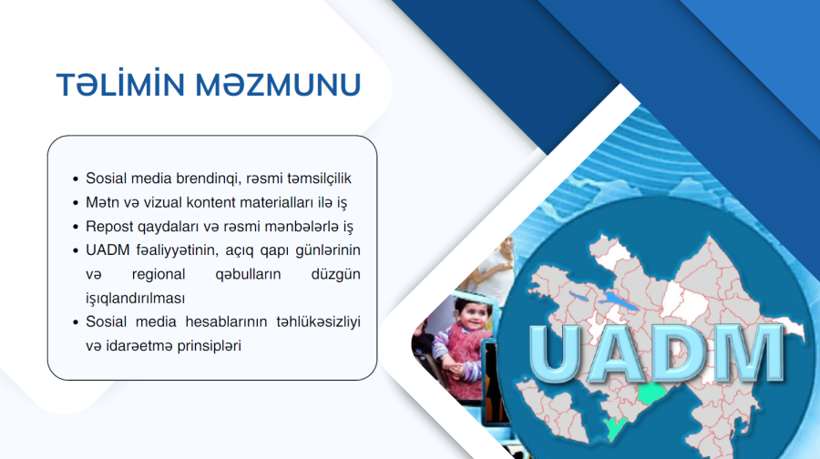 Dövlət Komitəsinin Analitik təhlil və informasiya təminatı şöbəsinin əməkdaşı Aysel Babayeva tərəfindən keçirilən təlim zamanı UADM-lərin sosial mediada rəsmi və vahid təmsilçiliyinin təmin edilməsi, paylaşım planlamasının düzgün qurulması, keyfiyyətli vizual və mətn kontentinin hazırlanması məsələləri ətraflı şəkildə izah edilib.