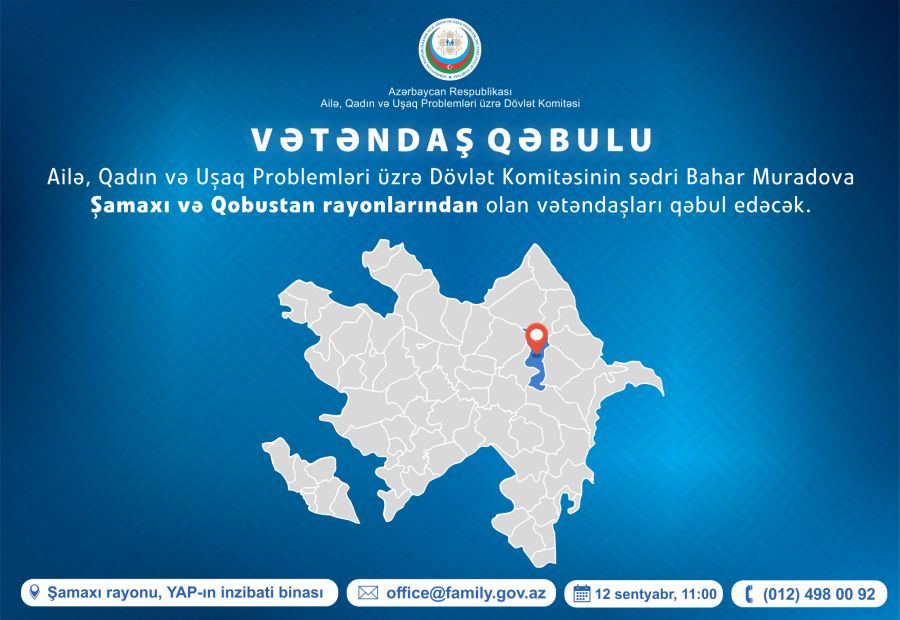 Ailə, Qadın və Uşaq Problemləri üzrə Dövlət Komitəsinin sədri Bahar Muradova 12 sentyabr 2025-ci il tarixində, saat 11:00-da YAP Şamaxı rayon təşkilatının inzibati binasında vətəndaşları qəbul edəcək. Qəbulda Şamaxı və Qobustan rayon sakinlərinin müraciətlərinə baxılacaq.